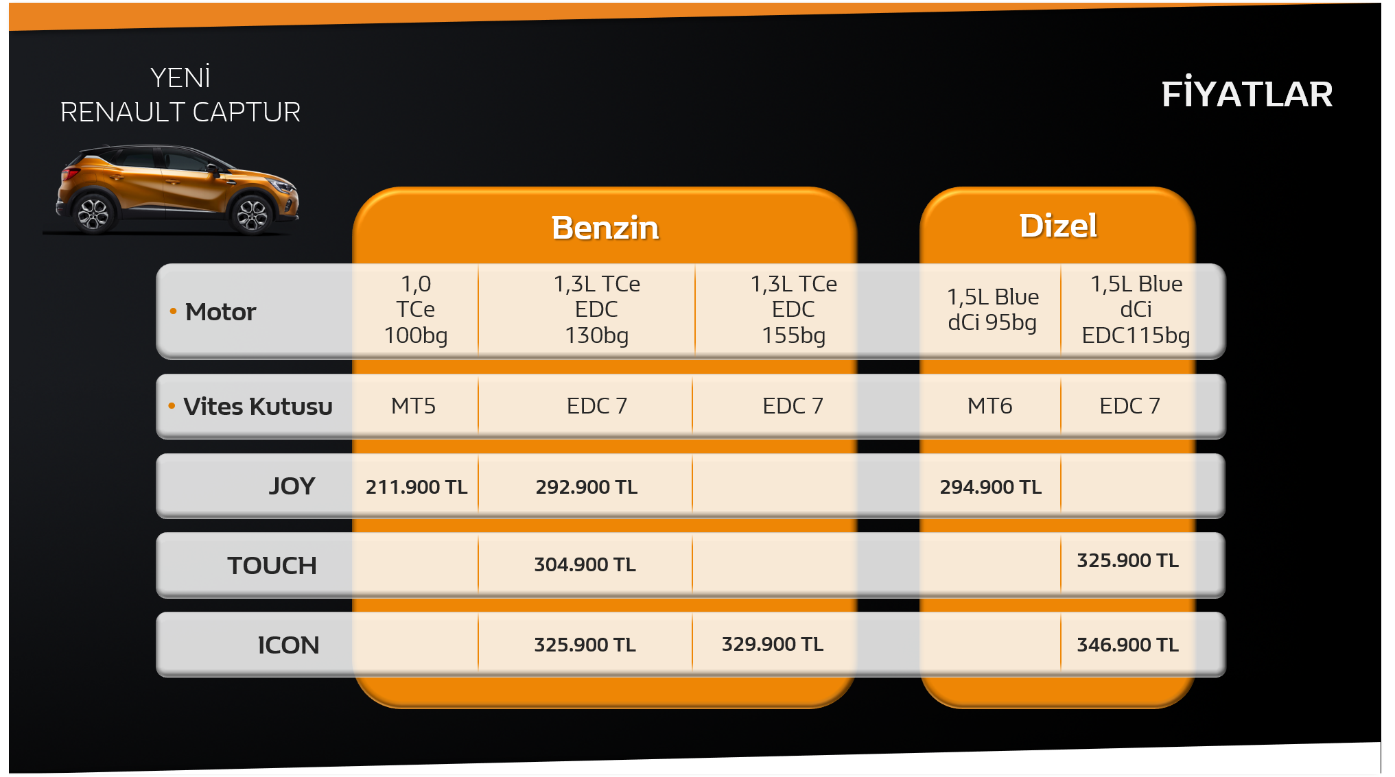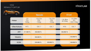 Yenilenen tamamı turbo özellikli verimli motor gamı kapsamında Yeni Captur, Türkiye’de 1.0 TCe 100 HP, 1.3 TCe EDC 130 HP, 1.3 TCe EDC 155 HP olmak üzere 3 benzinli, 1.5 Blue dCi 95 HP ve 1.5 Blue dCi EDC 115 HP olmak üzere 2 dizel ile geniş bir motor seçeneğini kullanıcılarla buluşturuyor.